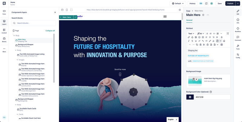 Our premier Caribbean resort company project required a global content structure that could support multiple resort brands, regions, and languages while allowing local marketing teams to manage updates independently. With Storyblok, we built a scalable headless solution that reduced update time, improved performance, and created a visually immersive digital experience for visitors wanting to learn more about the company and all of their resort brands.