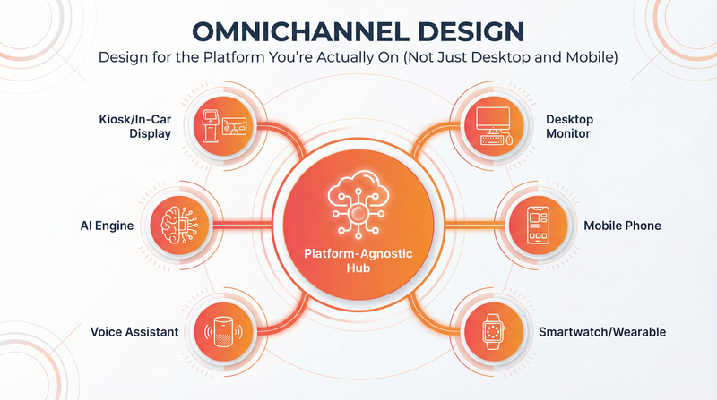 Design with platform agnostic content in mind. Use a headless CMS so your content can be delivered to any endpoint—web, mobile app, voice assistant, or AI engine—without reformatting. Think about how your information architecture translates across channels. A navigation menu that works on desktop might need to be restructured for voice or AI search.