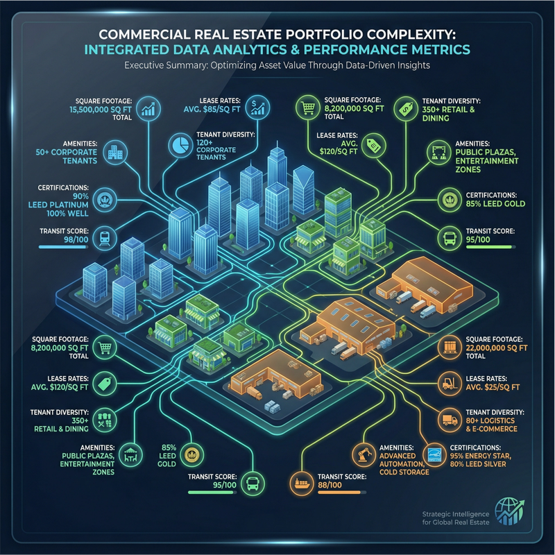 Properties have dozens of attributes: square footage, building class, amenities, certifications, transit scores, parking, tenant mix, lease terms, sustainability features.