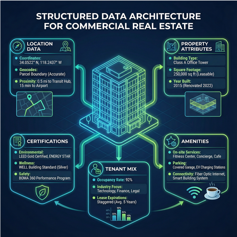 AI reads structured data to understand what your content represents. For CRE, this means: